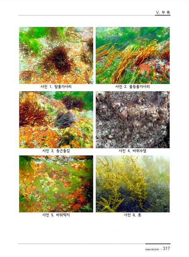 Ⅴ. 부 록 www.nie.re.kr ? 317 사진 1. 참풀가사리 사진 2. 불등풀가사리 사진 3. 둥근돌김 사진 4. 바위수염 사진 5. 바위딱지 사진 6.톳
