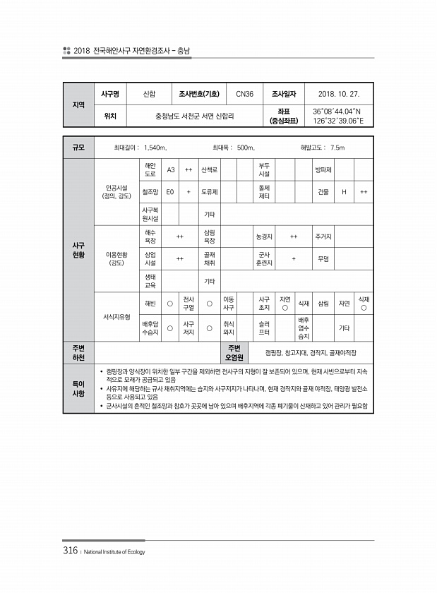 2018 전국해안사구 자연환경조사 충남 316 ? National Institute of Ecology 지역 사구명 신합 조사번호 기호 CN36 조사일자 2018. 10. 27. 위치 충청남도 서천군 서면 신합리 좌표 중심좌표 36°08′44.04″N 126°32′39.06″E 규모 최대길이 1,540m, 최대폭 500m, 해발고도 7.5m 사구 현황 인공시설 정의, 강도 해안 도로 A3 ++ 산책로 부두 시설 방파제 철조망 E0 + 도류제 돌제 제티 건물 H ++ 사구복 원시설 기타 이용현황 강도 해수 욕장 ++ 삼림 욕장 농경지 ++ 주거지 상업 시설 ++ 골재 채취 군사 훈련지 + 무덤 생태 교육 기타 서식지유형 해빈 ○ 전사 구열 ○ 이동 사구 사구 초지 자연 ○ 식재 삼림 자연 식재 ○ 배후담 수습...