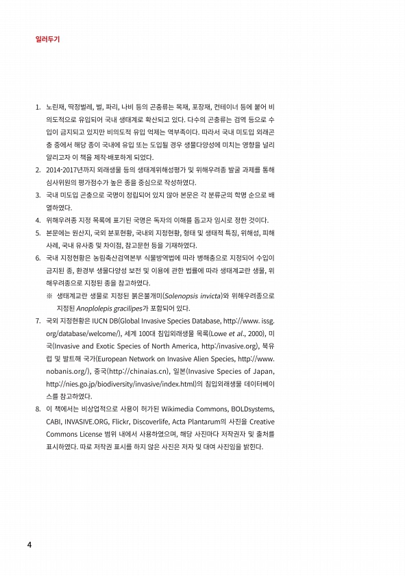 4 1. 노린재, 딱정벌레, 벌, 파리, 나비 등의 곤충류는 목재, 포장재, 컨테이너 등에 붙어 비 의도적으로 유입되어 국내 생태계로 확산되고 있다. 다수의 곤충류는 검역 등으로 수 입이 금지되고 있지만 비의도적 유입 억제는 역부족이다. 따라서 국내 미도입 외래곤 충 중에서 해당 종이 국내에 유입 또는 도입될 경우 생물다양성에 미치는 영향을 널리 알리고자 이 책을 제작·배포하게 되었다. 2. 2014-2017년까지 외래생물 등의 생태계위해성평가 및 위해우려종 발굴 과제를 통해 심사위원의 평가점수가 높은 종을 중심으로 작성하였다. 3. 국내 미도입 곤충으로 국명이 정립되어 있지 않아 본문은 각 분류군의 학명 순으로 배 열하였다. 4. 위해우려종 지정 목록에 표기된 국명은 독자의 이해를 돕고자 임시로 정한 것이...