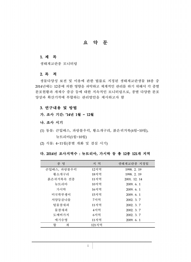 i 요 약 문 1. 제 목 생태계교란종 모니터링 2. 목 적 생물다양성 보전 및 이용에 관한 법률로 지정된 생태계교란생물 18종 중 2014년에는 12종에 의한 영향을 파악하고 체계적인 관리를 하기 위해서 각 종별 분포현황과 개체수 증감 등에 대한 지속적인 모니터링으로, 종별 다양한 분포 양상과 확산기작에 부합하는 관리방안을 제시하고자 함 3. 연구내용 및 방법 가. 조사 기간14년 1월 12월 나. 조사 시기 1 동물큰입배스, 파랑볼우럭, 황소개구리, 붉은귀거북 4월10월 , 뉴트리아 1월10월 2 식물411월 종별 개화 및 결실 시기 다. 2014년 조사지역수 뉴트리아, 가시박 등 총 12종 121개 지역 종 명 지 역 생태계교란종 지정일 큰입배스, 파랑볼우럭 12지역 1998. 2. 19 황소개구리 1...
