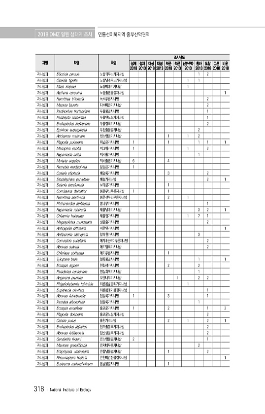 2018 DMZ 일원 생태계 조사 민통선이북지역 중부산악권역 318 ? National Institute of Ecology 과명 학명 국명 조사년도 성재 2018 성재 2013 대성 2018 대성 2013 적근 2018 적근 2013 산양+주파 2013 흰바 2013 도창 2018 고둔 2018 비운 2018 자나방과 Eilicrinia parvula 노랑귀무늬가지나방 1 2 자나방과 Obeidia tigrata 노랑날개무늬가지나방 1 1 자나방과 Idaea impexa 노랑띠애기자나방 1 자나방과 Asthena corculina 노랑줄흰물결자나방 1 자나방과 Hemithea tritonaria 녹색푸른자나방 2 자나방과 Macaria liturata 다색띠큰가지나방 2 자나방과 Xanthorhoe hor...