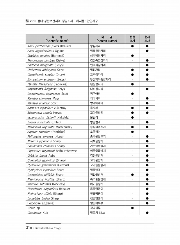 2016 생태·경관보전지역 정밀조사 하시동 · 안인사구 316 ? National Institute of Ecology 학 명 Scientific Name 국 명 Korean Name 문헌 조사 현지 조사 Anax parthenope julius Brauer 왕잠자리 ● ● Anax nigrofasciatus Oguma 먹줄왕잠자리 ● Davidius lunatus Bartenef 쇠측범잠자리 ● Trigomphus nigripes Selys 검정측범잠자리 ● Epitheca marginata Selys 언저리잠자리 ● Orthetrum albistylum Selys 밀잠자리 ● ● Crocothemis servilia Drury 고추잠자리 ● ● Sympetrum eroticum Selys ...