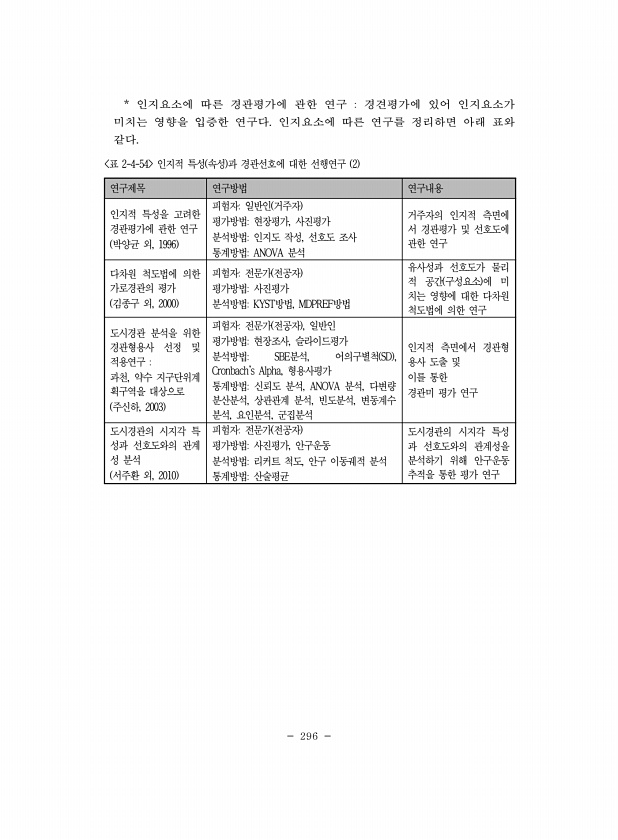 296 * 인지요소에 따른 경관평가에 관한 연구 경견평가에 있어 인지요소가 미치는 영향을 입증한 연구다. 인지요소에 따른 연구를 정리하면 아래 표와 같다. 연구제목 연구방법 연구내용 인지적 특성을 고려한 경관평가에 관한 연구 박양균 외, 1996 피험자일반인 거주자 평가방법현장평가, 사진평가 분석방법인지도 작성, 선호도 조사 통계방법ANOVA 분석 거주자의 인지적 측면에 서 경관평가 및 선호도에 관한 연구 다차원 척도법에 의한 가로경관의 평가 김종구 외, 2000 피험자전문가 전공자 평가방법사진평가 분석방법KYST방법, MDPREF방법 유사성과 선호도가 물리 적 공간 구성요소 에 미 치는 영향에 대한 다차원 척도법에 의한 연구 도시경관 분석을 위한 경관형용사 선정 및 적용연구 과천, 약수 지구단위계 획구역을...