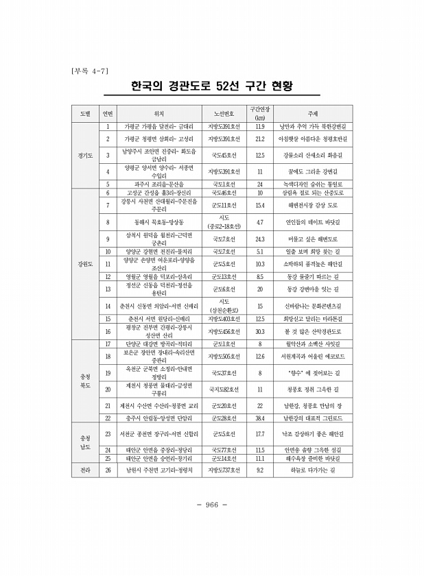 966 도별 연번 위치 노선번호 구간연장 km 주제 경기도 1 가평군 가평읍 달전리금대리 지방도391호선 11.9 낭만과 추억 가득 북한강변길 2 가평군 청평면 삼회리고성리 지방도391호선 21.2 아침햇살 아름다운 청평호반길 3 남양주시 조안면 진중리화도읍 금남리 국도45호선 12.5 강물소리 산새소리 화음길 4 양평군 양서면 양수리서종면 수입리 지방도391호선 11 꿈에도 그리운 강변길 5 파주시 조리읍문산읍 국도1호선 24 녹색디자인 숨쉬는 통일로 강원도 6 고성군 간성읍 흘3리장신리 국도46호선 10 삼림욕 절로 되는 산중도로 7 강릉시 사천면 산대월리주문진읍 주문리 군도11호선 15.4 해변전시장 감상 도로 8 동해시 묵호동망상동 시도 중로2-18호선 4.7 연인들의 데이트 바닷길 9 삼척시 원덕읍...