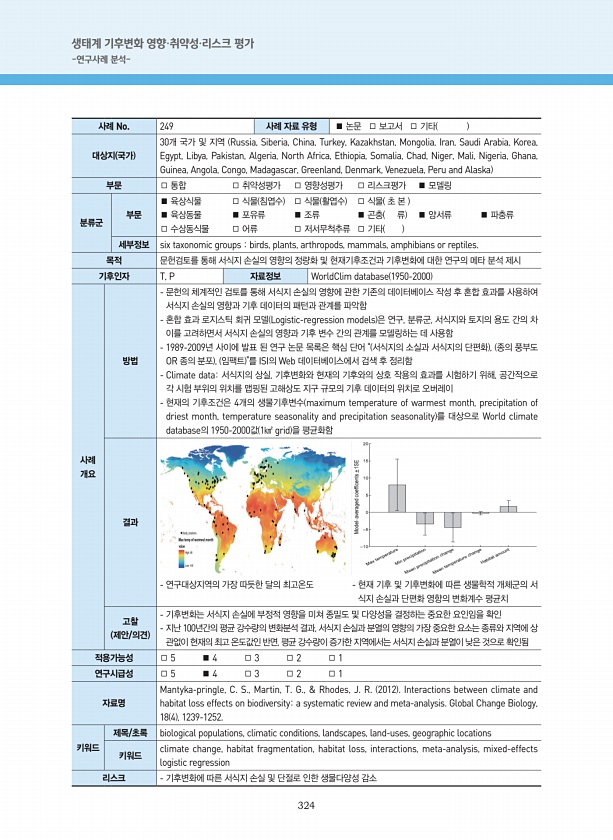 324 생태계 기후변화 영향·취약성·리스크 평가 -연구사례 분석- 사례 No. 249 사례 자료 유형 ■ 논문 □ 보고서 □ 기타 대상지 국가 30개 국가 및 지역 Russia, Siberia, China, Turkey, Kazakhstan, Mongolia, Iran, Saudi Arabia, Korea, Egypt, Libya, Pakistan, Algeria, North Africa, Ethiopia, Somalia, Chad, Niger, Mali, Nigeria, Ghana, Guinea, Angola, Congo, Madagascar, Greenland, Denmark, Venezuela, Peru and Alaska 부문 □ 통합 □ 취약성평가 □ 영향성평가 □ 리스크평가 ■ 모델링 분류군 부문...