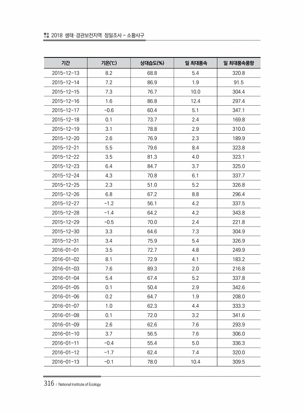2018 생태·경관보전지역 정밀조사 소황사구 316 ? National Institute of Ecology 기간 기온 ℃ 상대습도 % 일 최대풍속 일 최대풍속풍향 2015-12-13 8.2 68.8 5.4 320.8 2015-12-14 7.2 86.9 1.9 91.5 2015-12-15 7.3 76.7 10.0 304.4 2015-12-16 1.6 86.8 12.4 297.4 2015-12-17 -0.6 60.4 5.1 347.1 2015-12-18 0.1 73.7 2.4 169.8 2015-12-19 3.1 78.8 2.9 310.0 2015-12-20 2.6 76.9 2.3 189.9 2015-12-21 5.5 79.6 8.4 323.8 2015-12-22 3.5 81.3 4.0 323.1 2015-1...
