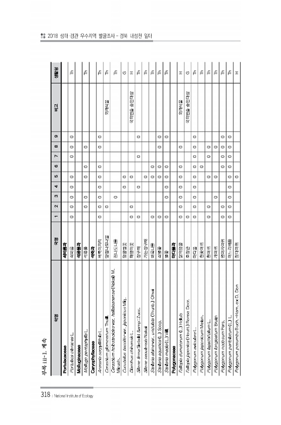 318 학명 국명 1 2 3 4 5 6 7 8 9 비고 생활형 Portulacaceae 쇠비름과 Portulaca oleracea L. 쇠비름 0 0 0 0 0 0 0 0 Th Molluginaceae 석류풀과 Mollugo pentaphylla L. 석류풀 0 0 0 0 0 Th Caryophyllaceae 석죽과 Arenaria serpyllifolia L. 벼룩이자리 0 0 0 0 0 0 0 0 Th Cerastium glomeratum Thuill. 양점나도나물 0 외래식물 Th Cerastium holosteoides var. hallaisanense Nakai M. Mizush. 점나도나물 0 Th Cucubalus baccifer var. japonicus Miq. 덩굴별꽃 0 0 G Diant...