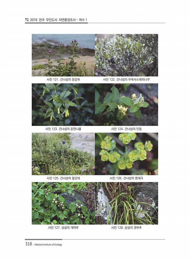 2018 전국 무인도서 자연환경조사 여수 1 318 ? National Institute of Ecology 사진 121. 건너섬의 엉겅퀴 사진 122. 건너섬의 우묵사스레피나무 사진 123. 건너섬의 윤판나물 사진 124. 건너섬의 인동 사진 125. 건너섬의 절굿대 사진 126. 건너섬의 흰대극 사진 127. 상섬의 개머루 사진 128. 상섬의갯부추