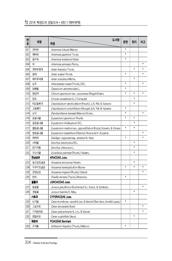 2018 특정도서 정밀조사 신안 1 북부권역 314 ? National Institute of Ecology 번 호 국명 도서명 학명 문헌 현지 비고 201 큰비쑥 Artemisia fukudo Makino * 202 제비쑥 Artemisia japonica Thunb. * 203 율무쑥 Artemisia koidzumii Nakai * 204 쑥 Artemisia princeps Pamp. * 205 갯쑥부쟁이 Aster hispidus Thunb. * * 206 참취 Aster scaber Thunb. * * 207 비자루국화 Aster subulatus Michx. * 208 삽주 Atractylodes ovata Thunb. DC. * * 209 담배풀 ...