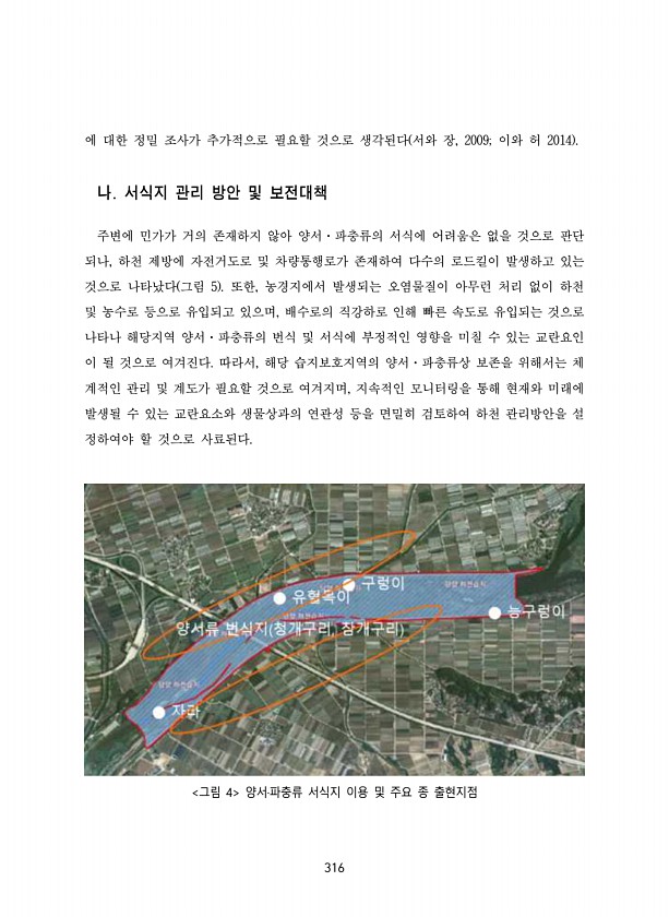 316 에 대한 정밀 조사가 추가적으로 필요할 것으로 생각된다 서와 장, 2009; 이와 허 2014 나. 서식지 관리 방안 및 보전대책 주변에 민가가 거의 존재하지 않아 양서·파충류의 서식에 어려움은 없을 것으로 판단 되나, 하천 제방에 자전거도로 및 차량통행로가 존재하여 다수의 로드킬이 발생하고 있는 것으로 나타났다 그림 5 또한, 농경지에서 발생되는 오염물질이 아무런 처리 없이 하천 및 농수로 등으로 유입되고 있으며, 배수로의 직강하로 인해 빠른 속도로 유입되는 것으로 나타나 해당지역 양서·파충류의 번식 및 서식에 부정적인 영향을 미칠 수 있는 교란요인 이 될 것으로 여겨진다. 따라서, 해당 습지보호지역의 양서·파충류상 보존을 위해서는 체 계적인 관리 및 계도가 필요할 것으로 여겨지며, 지속적인 모니터...