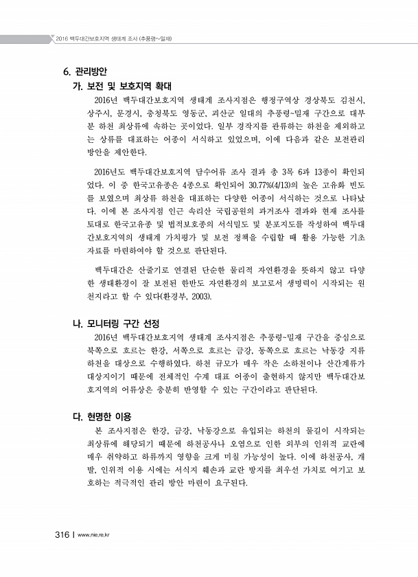 2016 백두대간보호지역 생태계 조사 추풍령밀재 316Ⅰwww.nie.re.kr 6. 관리방안 가. 보전 및 보호지역 확대 2016년 백두대간보호지역 생태계 조사지점은 행정구역상 경상북도 김천시, 상주시, 문경시, 충청북도 영동군, 괴산군 일대의 추풍령밀재 구간으로 대부 분 하천 최상류에 속하는 곳이었다. 일부 경작지를 관류하는 하천을 제외하고 는 상류를 대표하는 어종이 서식하고 있었으며, 이에 다음과 같은 보전관리 방안을 제안한다. 2016년도 백두대간보호지역 담수어류 조사 결과 총 3목 6과 13종이 확인되 었다. 이 중 한국고유종은 4종으로 확인되어 30.77% 4/13 의 높은 고유화 빈도 를 보였으며 최상류 하천을 대표하는 다양한 어종이 서식하는 것으로 나타났 다. 이에 본 조사지점 인근 속리산 국...