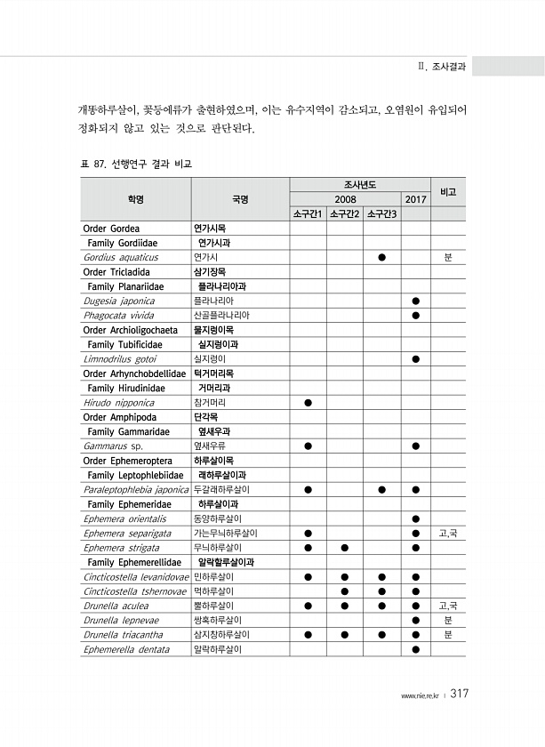 Ⅱ. 조사결과 www.nie.re.kr ? 317 학명 국명 조사년도 비고 2008 2017 소구간1 소구간2 소구간3 Order Gordea 연가시목 Family Gordiidae 연가시과 Gordius aquaticus 연가시 ● 분 Order Tricladida 삼기장목 Family Planariidae 플라나리아과 Dugesia japonica 플라나리아 ● Phagocata vivida 산골플라나리아 ● Order Archioligochaeta 물지렁이목 Family Tubificidae 실지렁이과 Limnodrilus gotoi 실지렁이 ● Order Arhynchobdellidae 턱거머리목 Family Hirudinidae 거머리과 Hirudo nipponica 참거머리 ● Order Amph...