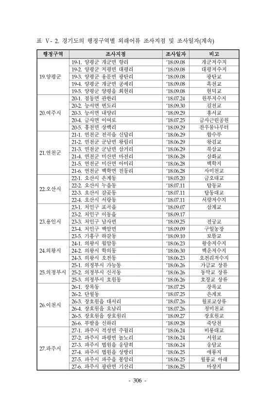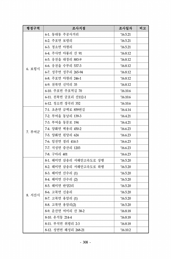 308 행정구역 조사지점 조사일자 비고 6. 보령시 6-1. 동대동 주공사거리 ‘16.5.21 6-2. 주포면 보령리 ‘16.5.21 6-3. 청소면 야현리 ‘16.5.21 6-4. 주사면 야룡리 산 91 ‘16.8.12 6-5. 웅천읍 대창리 883-9 ‘16.8.12 6-6. 웅천읍 수부리 537-3 ‘16.8.12 6-7. 성주면 성주리 265-94 ‘16.8.12 6-8. 주포면 야현리 246-1 ‘16.8.12 6-9. 천북면 신덕리 35 ‘16.8.12 6-10. 주포면 주포역길 70 ‘16.10.6 6-11. 천북면 궁포리 산112-1 ‘16.10.6 6-12. 청소면 장곡리 352 ‘16.10.6 7. 부여군 7-1. 초촌면 금백로 859번길 ‘16.4.14 7-2. 부여읍 동남리 139-3 ...