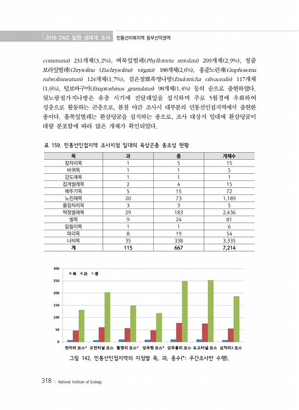 2016 DMZ 일원 생태계 조사 민통선이북지역 동부산악권역 318 ? National Institute of Ecology communa 231개체 3.2% , 벼룩잎벌레 Phyllotreta striolata 209개체 2.9% , 청줄 보라잎벌레 Chrysolina Euchrysolina virgata 188개체 2.6% , 홍줄노린재 Graphosoma rubrolinneatum 124개체 1.7% , 검은점뾰족명나방 Endotricha olivacealis 117개체 1.6% , 털보바구미 Enaptorhinus granulatus 98개체 1.4% 등의 순으로 출현하였다. 뒷노랑점가지나방은 유충 시기에 진달래잎을 섭식하며 주로 5월경에 우화하여 성충으로 활동하는 곤충으로, 봄철 야간 조사시 대부분...