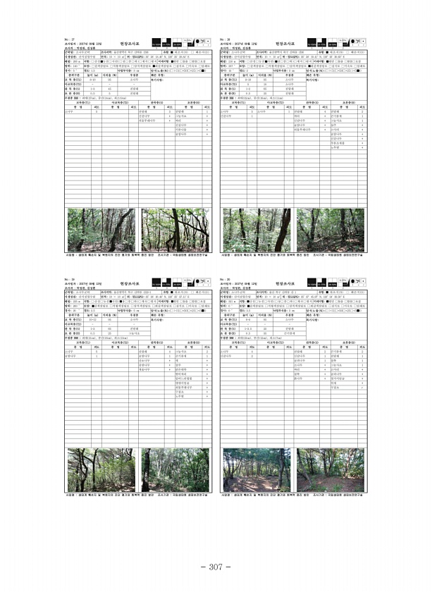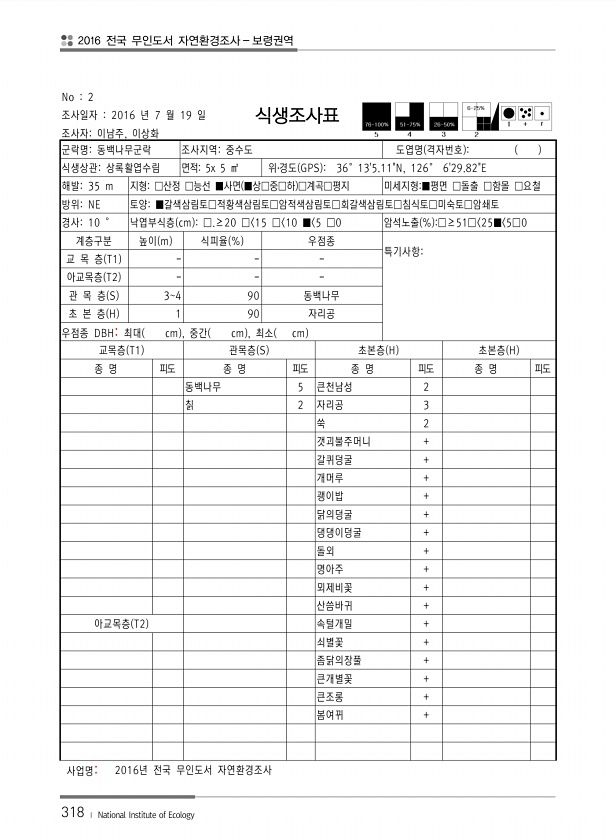 2016 전국 무인도서 자연환경조사 보령권역 318 ? National Institute of Ecology No 2 조사일자 2016 년 7 월 19 일 조사자이남주, 이상화 식생조사표 군락명동백나무군락 조사지역중수도 도엽명 격자번호 식생상관상록활엽수림 면적5x 5 ㎡ 위?경도 GPS 36°135.11N, 126° 629.82E 해발35 m 지형□산정 □능선 ■사면 ■상□중□하 □계곡□평지 미세지형■평면 □돌출 □함몰 □요철 방위NE 토양■갈색삼림토□적황색삼림토□암적색삼림토□회갈색삼림토□침식토□미숙토□암쇄토 경사10 ° 낙엽부식층 cm □.≥20 □ 15 □ 10 ■ 5 □0 암석노출 % □≥51□ 25■ 5□0 계층구분 높이 m 식피율 % 우점종 특기사항교 목 층 T1 아교목층 T2 관 목 층 S 34 ...