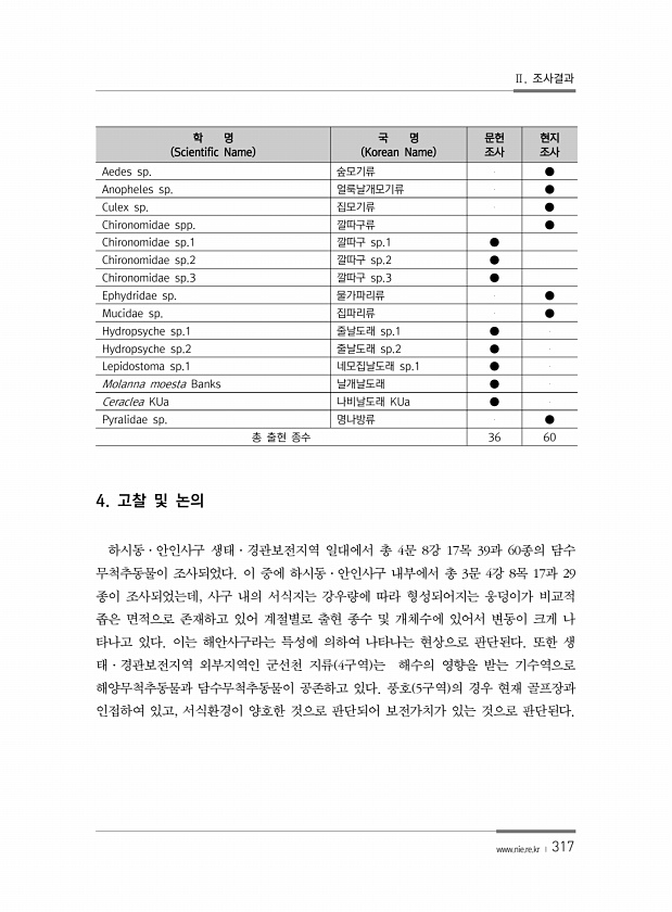 Ⅱ. 조사결과 www.nie.re.kr ? 317 학 명 Scientific Name 국 명 Korean Name 문헌 조사 현지 조사 Aedes sp. 숲모기류 ● Anopheles sp. 얼룩날개모기류 ● Culex sp. 집모기류 ● Chironomidae spp. 깔따구류 ● Chironomidae sp.1 깔따구 sp.1 ● Chironomidae sp.2 깔따구 sp.2 ● Chironomidae sp.3 깔따구 sp.3 ● Ephydridae sp. 물가파리류 ● Mucidae sp. 집파리류 ● Hydropsyche sp.1 줄날도래 sp.1 ● Hydropsyche sp.2 줄날도래 sp.2 ● Lepidostoma sp.1 네모집날도래 sp.1 ● Molanna...