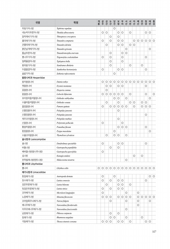 327 쥐빛가지나방 Tephrina vapulata ○ 네눈박이푸른자나방 Thetidia albocostaria ○ ○ ○ ○ ○ ○ ○ 알락제비가지나방 Thinopteryx crocoptera ○ ○ 홍띠애기자나방 Timandra comptaria ○ ○ ○ ○ ○ ○ ○ ○ ○ ○ 큰홍띠애기자나방 Timandra dichela ○ ○ ○ ○ ○ 붉은날개애기자나방 Timandra griseata ○ ○ 톱날푸른자나방 Timandromorpha enervata ○ ○ ○ 뽕나무가지나방 Trigonotylus coelestialium ○ ○ ○ ○ 얼룩물결자나방 Typloptera bella ○ ○ 흰띠왕가지나방 Xandrames dholaria ○ ○ ○ 두줄물결자나방 Xanthorhoe hortensiar...