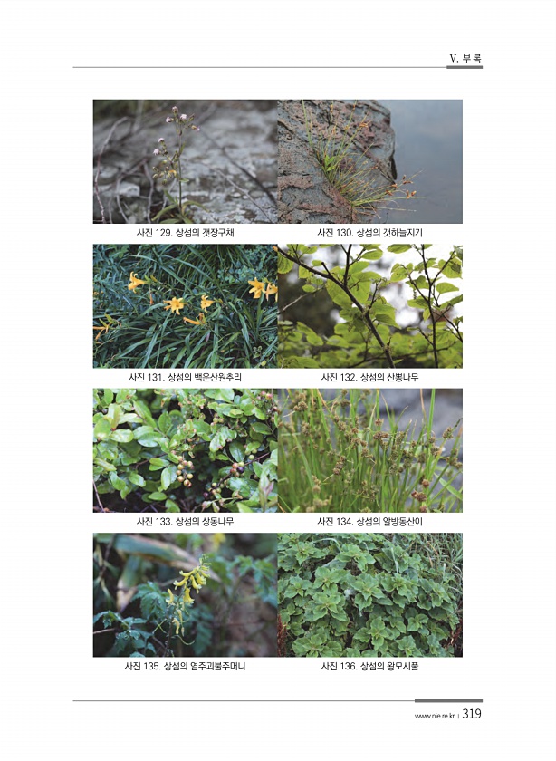 V. 부 록 www.nie.re.kr ?319 사진 129. 상섬의 갯장구채 사진 130. 상섬의 갯하늘지기 사진 131. 상섬의 백운산원추리 사진 132. 상섬의 산뽕나무 사진 133. 상섬의 상동나무 사진 134. 상섬의 알방동산이 사진 135. 상섬의 염주괴불주머니 사진 136. 상섬의왕모시풀
