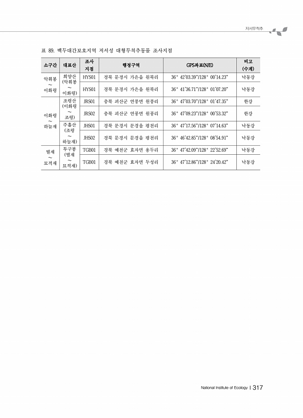 저서무척추 National Institute of EcologyⅠ317 소구간 대표산 조사 지점 행정구역 GPS좌표 N/E 비 수고계 악휘봉 ∼ 이화령 희양산 악휘봉 ∼ 이화령 HYS01 경북 문경시 가은읍 원북리 36° 4203.39/128° 0014.23낙동강 HYS01 경북 문경시 가은읍 원북리 36° 4136.71/128° 0107.20낙동강 이화령 ∼ 하늘재 조령산 이화령 ∼ 조령 JRS01 충북 괴산군 연풍면 원풍리 36° 4703.70/128° 0147.35한강 JRS02 충북 괴산군 연풍면 원풍리 36° 4709.23/128° 0053.32한강 주흘산 조령 ∼ 하늘재 JHS01 경북 문경시 문경읍 평천리 36° 4717.56/128° 0714.63낙동강 JHS02 경북 문경시 문경읍 평천리 3...