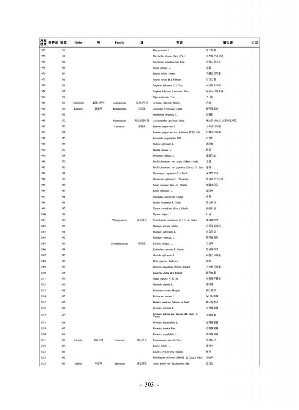 303 전체 번호 분류군 번호 Order 목 Family 과 학명 일반명 비고 972 560 Poa pratensis L. 왕포아풀 973 561 Puccinellia distans Jacq. Parl. 처진미꾸리광이 974 562 Saccharum arundinaceum Retz. 큰개사탕수수 975 563 Secale cereale L. 호밀 976 564 Setaria faberii Herrm. 가을강아지풀 977 565 Setaria viridis L. P.Beauv. 강아지풀 978 566 Sorghum halepense L. Pers. 시리아수수새 979 567 Sorghum halepense f. muticum Hubb. 무망시리아수새 980 568 Stipa tenuissima Trin. 스티...