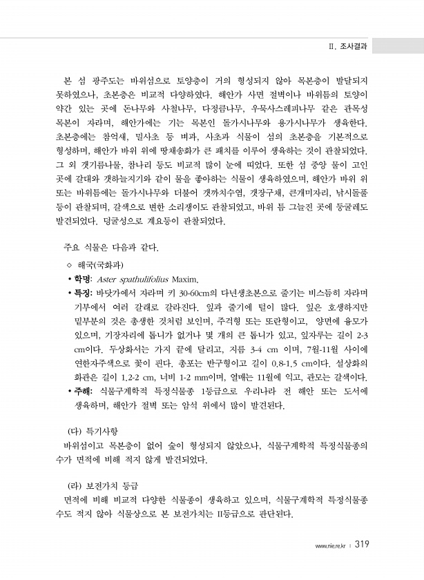 Ⅱ. 조사결과 www.nie.re.kr ? 319 본 섬 광주도는 바위섬으로 토양층이 거의 형성되지 않아 목본층이 발달되지 못하였으나, 초본층은 비교적 다양하였다. 해안가 사면 절벽이나 바위틈의 토양이 약간 있는 곳에 돈나무와 사철나무, 다정큼나무, 우묵사스레피나무 같은 관목성 목본이 자라며, 해안가에는 기는 목본인 돌가시나무와 용가시나무가 생육한다. 초본층에는 참억새, 밀사초 등 벼과, 사초과 식물이 섬의 초본층을 기본적으로 형성하며, 해안가 바위 위에 땅채송화가 큰 패치를 이루어 생육하는 것이 관찰되었다. 그 외 갯기름나물, 참나리 등도 비교적 많이 눈에 띠었다. 또한 섬 중앙 물이 고인 곳에 갈대와 갯하늘지기와 같이 물을 좋아하는 식물이 생육하였으며, 해안가 바위 위 또는 바위틈에는 돌가시나무와 더불어...