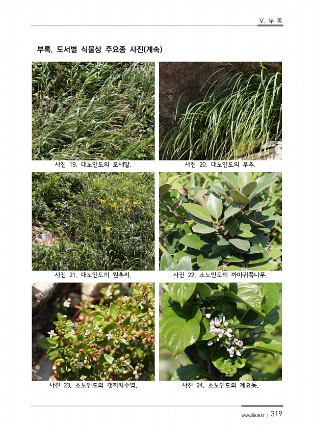 Ⅴ. 부 록 www.nie.re.kr ? 319 부록. 도서별 식물상 주요종 사진 계속 사진 19. 대노인도의 모새달. 사진 20. 대노인도의 부추. 사진 21. 대노인도의 원추리. 사진 22. 소노인도의 까마귀쪽나무. 사진 23. 소노인도의 갯까치수염. 사진 24. 소노인도의계요등.