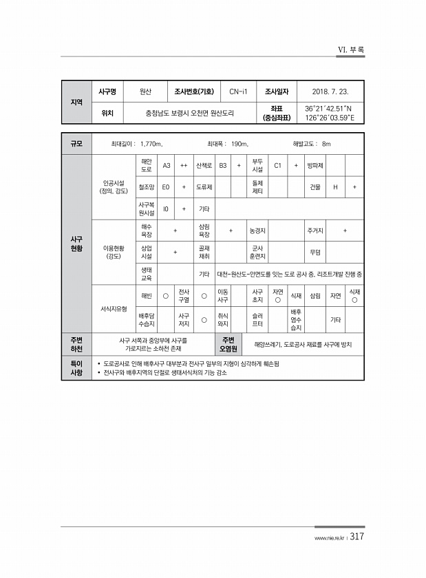 VI. 부 록 www.nie.re.kr ?317 지역 사구명 원산 조사번호 기호 CN-i1 조사일자 2018. 7. 23. 위치 충청남도 보령시 오천면 원산도리 좌표 중심좌표 36°21′42.51″N 126°26′03.59″E 규모 최대길이 1,770m, 최대폭 190m, 해발고도 8m 사구 현황 인공시설 정의, 강도 해안 도로 A3 ++ 산책로 B3 + 부두 시설 C1 + 방파제 철조망 E0 + 도류제 돌제 제티 건물 H + 사구복 원시설 I0 + 기타 이용현황 강도 해수 욕장 + 삼림 욕장 + 농경지 주거지 + 상업 시설 + 골재 채취 군사 훈련지 무덤 생태 교육 기타 대천-원산도-안면도를 잇는 도로 공사 중, 리조트개발 진행 중 서식지유형 해빈 ○ 전사 구열 ○ 이동 사구 사구 초지 자연 ○ 식재 삼림...