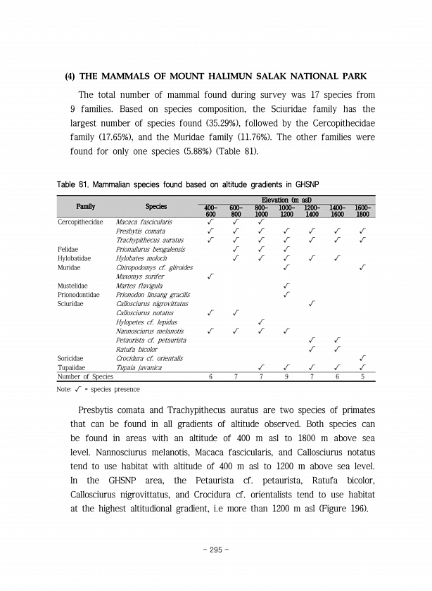 4 THE MAMMALS OF MOUNT HALIMUN SALAK NATIONAL PARK The total number of mammal found during survey was 17 species from 9 families. Based on species composition, the Sciuridae family has the largest number of species found 35.29% , followed by the Cercopithecidae family 17.65% , and the Muridae family 11.76% The other families were found for only one species 5.88% Table 81 Family Species Elevation m...