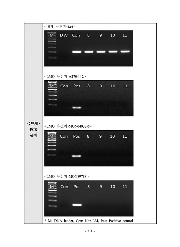 311 2단계 PCR 분석 내재 유전자-Le1 LMO 유전자-A2704-12 LMO 유전자-MON04032-6 LMO 유전자-MON89788 * MDNA ladder, ConNon-LM, PosPositivecontrol