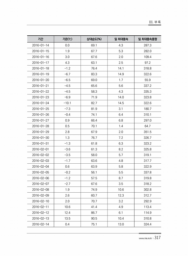 III. 부 록 www.nie.re.kr ?317 기간 기온 ℃ 상대습도 % 일 최대풍속 일 최대풍속풍향 2016-01-14 0.0 69.1 4.3 287.3 2016-01-15 1.9 67.7 5.3 282.0 2016-01-16 3.0 67.6 2.0 109.4 2016-01-17 4.3 63.1 2.5 97.2 2016-01-18 -1.2 76.4 14.1 318.8 2016-01-19 -6.7 83.3 14.9 322.6 2016-01-20 -6.5 69.0 1.7 55.9 2016-01-21 -4.5 65.6 5.6 337.2 2016-01-22 -4.5 58.3 4.3 335.3 2016-01-23 -6.9 71.9 14.0 323.8 2016-01-24 -10.1 82.7 14.5 322.6 2...