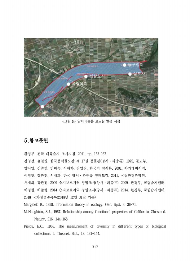 317 그림 5 양서·파충류 로드킬 발생 지점 5.참고문헌 환경부. 전국 내륙습지 조사지침. 2011. pp. 153-167. 강영선, 윤일병. 한국동식물도감 제 17권 동물편 양서·파충류 , 1975, 문교부. 양서영, 김종범, 민미숙, 서재화, 강영진. 한국의 양서류, 2001, 아카데미서적. 이정현, 장환진, 서재화. 한국 양서·파충류 생태도감, 2011, 국립환경과학원. 서재화, 장환진. 2009 습지보호지역 정밀조사 양서·파충류 2009. 환경부, 국립습지센터. 이정현, 허준행. 2014 습지보호지역 정밀조사 양서·파충류 2014. 환경부, 국립습지센터. 2018 국가생물종목록 2018년 12월 31일 기준 Margalef, R., 1958. Information theory in ecology. ...