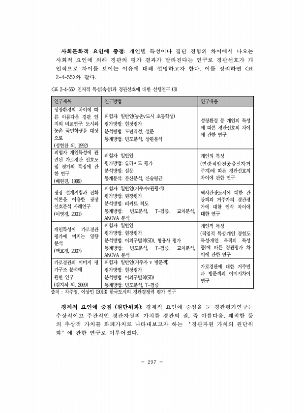 297 연구제목 연구방법 연구내용 성장환경의 차이에 따 른 아름다운 경관 인 지의 비교연구도시와 농촌 국민학생을 대상 으로 성현찬 외, 1992 피험자일반인 농촌v도시 초등학생 평가방법현장평가 분석방법도면작성, 설문 통계방법빈도분석, 상관분석 성장환경 등 개인의 특성 에 따른 경관선호의 차이 에 관한 연구 피험자 개인특성에 관 련된 가로경관 선호도 및 평가의 특징에 관 한 연구 배현진, 1999 피험자일반인 평가방법슬라이드 평가 분석방법설문 통계분석분산분석, 산술평균 개인의 특성 연령?직업?전공?출신지?거 주지 에 따른 경관선호의 차이에 관한 연구 광장 설계지침과 진화 이론을 이용한 광장 선호분석 사례연구 이영경, 2001 피험자일반인 거주자v관광객 평가방법현장평가 분석방법리커트 척도 통계방법빈도분석, T-...