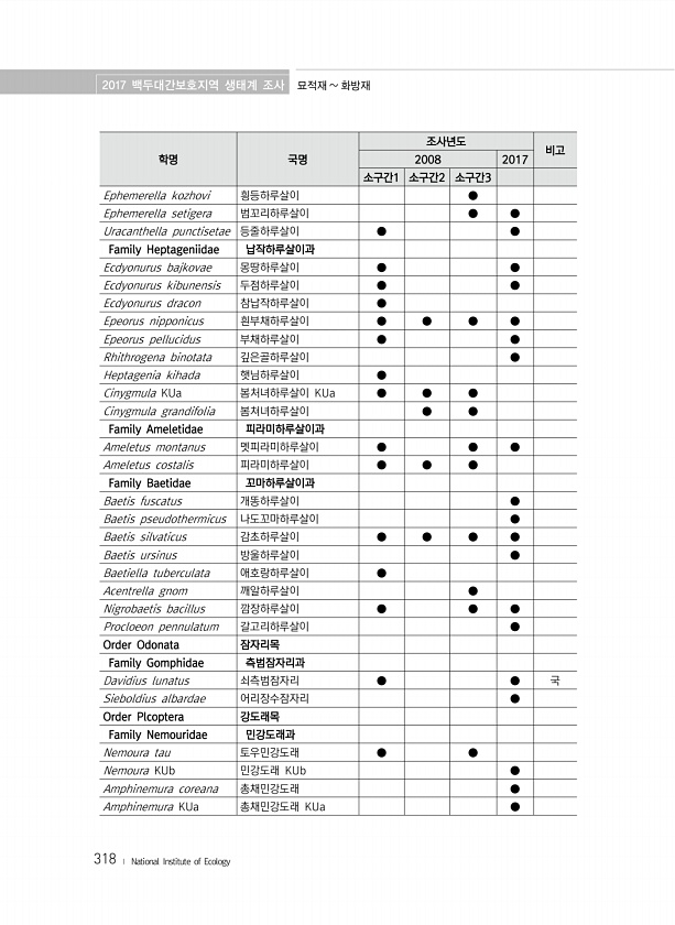 2017 백두대간보호지역 생태계 조사 묘적재 화방재 318 ? National Institute of Ecology 학명 국명 조사년도 비고 2008 2017 소구간1 소구간2 소구간3 Ephemerella kozhovi 힁등하루살이 ● Ephemerella setigera 범꼬리하루살이 ● ● Uracanthella punctisetae 등줄하루살이 ● ● Family Heptageniidae 납작하루살이과 Ecdyonurus bajkovae 몽땅하루살이 ● ● Ecdyonurus kibunensis 두점하루살이 ● ● Ecdyonurus dracon 참납작하루살이 ● Epeorus nipponicus 흰부채하루살이 ● ● ● ● Epeorus pellucidus 부채하루살이 ● ● Rhithrogena ...