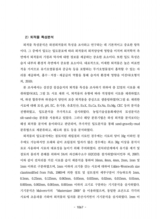 1067 2 퇴적물 특성분석 퇴적물 특성분석은 하천퇴적물의 특성을 조사하고 연구하는 데 기본적이고 중요한 항목 이다. 그 중에서 입도는 입도분포에 따라 퇴적물의 퇴적양상에 영항을 미치며 퇴적학적 측 면에서 퇴적물의 기원과 역사에 대한 정보를 제공하는 중요한 요소이다. 또한 입도 특성은 습지 내부의 환경적 측면에서 중요한 요소이다. 대표적으로, 미세한 퇴적물은 높은 비표면 적을 가지므로 유기오염물질과 중금속 등을 포함하는 무기오염물질이 흡착할 수 있는 자 리를 제공하며, 흡수·저장·재공급의 역할을 통해 습지의 환경에 영향을 미친다 오형석 외, 2010 본 조사에서는 섬진강 침실습지의 퇴적물 특성을 조사하기 위하여 총 12점의 시료를 채 취하였다 표3, 그림 3 시료 채취 시, 퇴적물의 유형에 따라 적정량의 시...