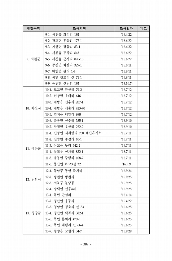 309 행정구역 조사지점 조사일자 비고 9. 서천군 9-1. 서천읍 화성리 192 ‘16.4.22 9-2. 판교면 후동리 177-1 ‘16.6.22 9-3. 기산면 광암리 83-1 ‘16.6.22 9-4. 서천읍 두왕리 643 ‘16.6.22 9-5. 서천읍 군사리 826-13 ‘16.6.22 9-6. 종천면 화산리 329-1 ‘16.8.11 9-7. 비인면 관리 1-4 ‘16.8.11 9-8. 서면 월호리 산 71-1 ‘16.8.11 9-9. 종천면 산천리 192 ‘16.10.7 10. 아산시 10-1. 도고면 금산리 79-2 ‘16.7.12 10-2. 신창면 읍내리 646 ‘16.7.12 10-3. 배방읍 신흥리 207-1 ‘16.7.12 10-4. 배방읍 세출리 413-70 ‘16.7.12 10-5. ...
