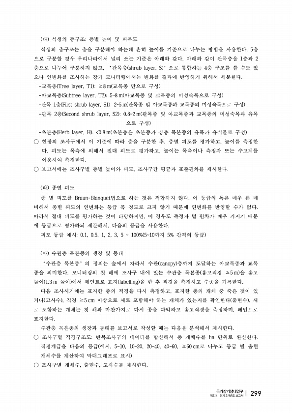 다 식생의 층구조층별 높이 및 피복도 식생의 층구조는 층을 구분해야 하는데 흔히 높이를 기준으로 나누는 방법을 사용한다. 5층 으로 구분할 경우 우리나라에서 널리 쓰는 기준은 아래와 같다. 아래와 같이 관목층을 1층과 2 층으로 나누어 구분하지 않고, ‘관목층 shrub layer, S ’ 으로 통합하는 4층 구조를 쓸 수도 있 으나 연변화를 조사하는 장기 모니터링에서는 변화를 결과에 반영하기 위해서 세분한다. -교목층 Tree layer, T1 ≥8 m 교목종 만으로 구성 -아교목층 Subtree layer, T2 58 m 아교목종 및 교목종의 미성숙목으로 구성 -관목 1층 First shrub layer, S1 25 m 관목종 및 아교목종과 교목종의 미성숙목으로 구성 -관목 2층 Second shrub ...