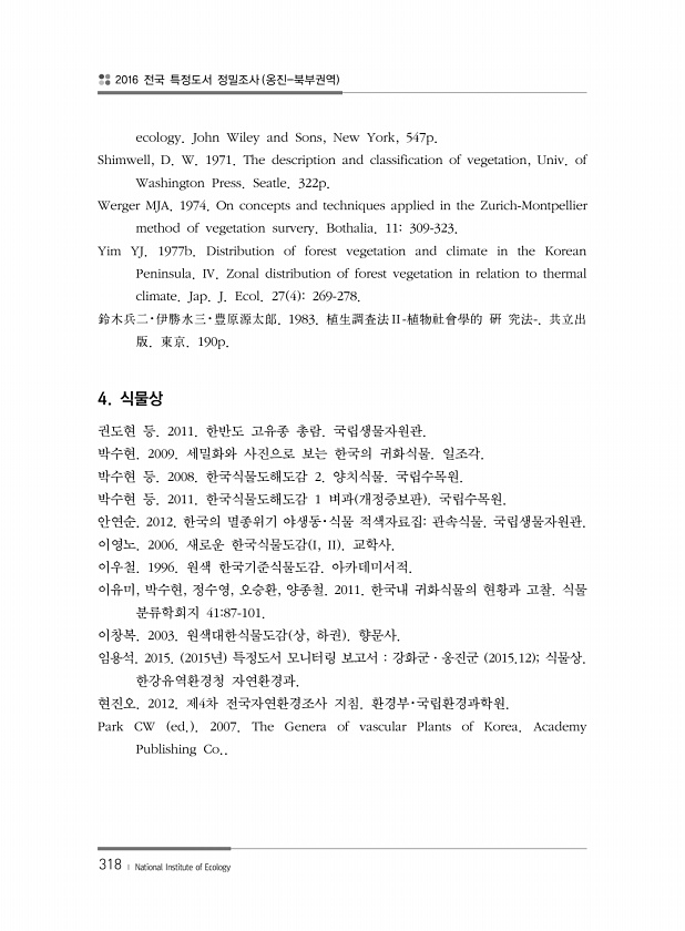 2016 전국 특정도서 정밀조사 옹진-북부권역 318 ? National Institute of Ecology ecology. John Wiley and Sons, New York, 547p. Shimwell, D. W. 1971. The description and classification of vegetation, Univ. of Washington Press. Seatle. 322p. Werger MJA. 1974. On concepts and techniques applied in the Zurich-Montpellier method of vegetation survery. Bothalia. 11309-323. Yim YJ. 1977b. Distribution of forest vegetation ...