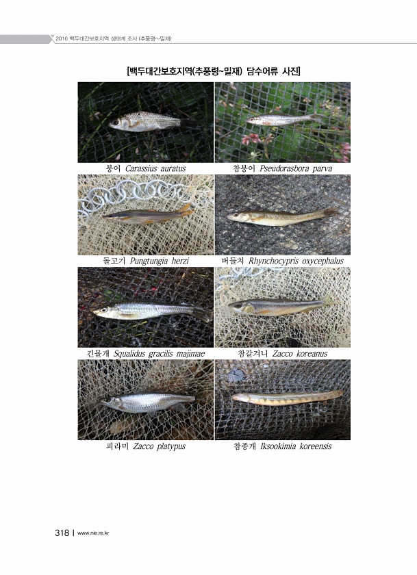 2016 백두대간보호지역 생태계 조사 추풍령밀재 318Ⅰwww.nie.re.kr [백두대간보호지역 추풍령밀재 담수어류 사진] 붕어 Carassius auratus 참붕어 Pseudorasbora parva 돌고기 Pungtungia herzi 버들치 Rhynchocypris oxycephalus 긴몰개 Squalidus gracilis majimae 참갈겨니 Zacco koreanus 피라미 Zacco platypus 참종개 Iksookimiakoreensis