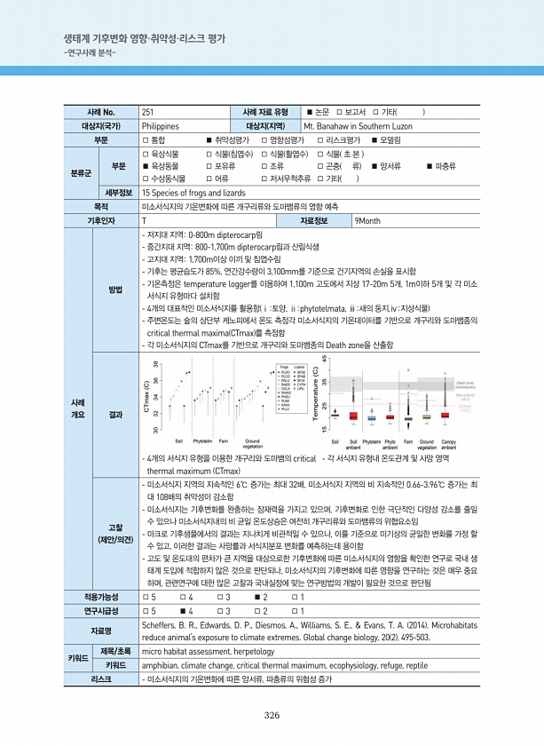 326 생태계 기후변화 영향·취약성·리스크 평가 -연구사례 분석- 사례 No. 251 사례 자료 유형 ■ 논문 □ 보고서 □ 기타 대상지 국가 Philippines 대상지 지역 Mt. Banahaw in Southern Luzon 부문 □ 통합 ■ 취약성평가 □ 영향성평가 □ 리스크평가 ■ 모델링 분류군 부문 □ 육상식물 □ 식물 침엽수 □ 식물 활엽수 □ 식물 초 본 ■ 육상동물 □ 포유류 □ 조류 □ 곤충 류 ■ 양서류 ■ 파충류 □ 수상동식물 □ 어류 □ 저서무척추류 □ 기타 세부정보 15 Species of frogs and lizards 목적 미소서식지의 기온변화에 따른 개구리류와 도마뱀류의 영향 예측 기후인자 T 자료정보 9Month 사례 개요 방법 저지대 지역0-800m dipterocarp림 ...