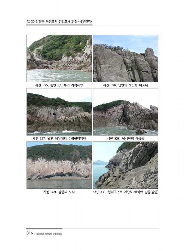 2016 전국 특정도서 정밀조사 옹진-남부권역 316 ? National Institute of Ecology 사진 325. 동안 만입부의 거력해안 사진 326. 남안의 벌집형 타포니 사진 327. 남안 해식애의 수직절리지형 사진 328. 남서단의 해식동 사진 329. 남안의 노치 사진 330. 절리구조로 계단식 해식애 발달 남안