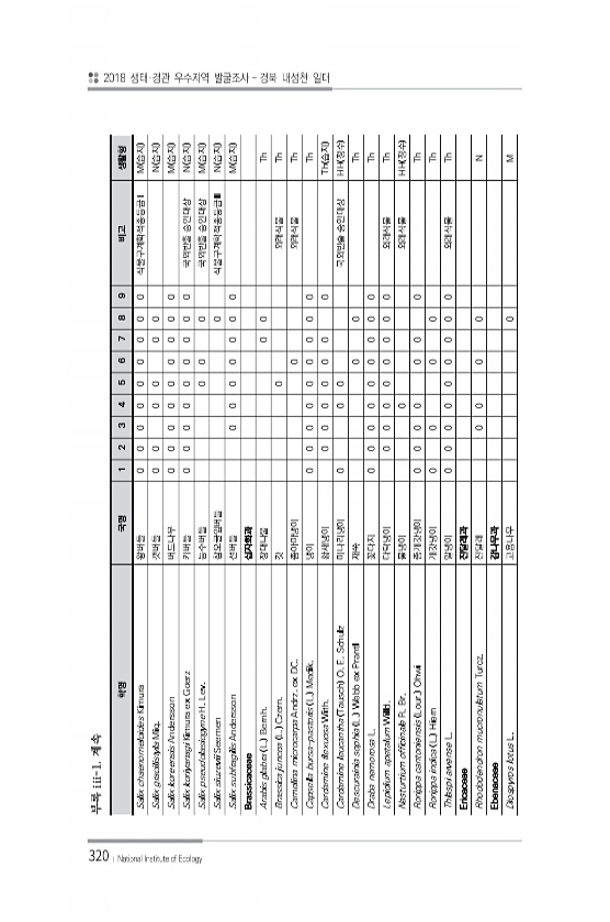 320 학명 국명 1 2 3 4 5 6 7 8 9 비고 생활형 Salix chaenomeloides Kimura 왕버들 0 0 0 0 0 0 0 0 0 식물구계학적종등급Ⅰ M 습지 Salix gracilistyla Miq. 갯버들 0 0 0 0 0 0 N 습지 Salix koreensis Andersson 버드나무 0 0 0 0 0 0 0 0 0 M 습지 Salix koriyanagi Kimura ex Goerz 키버들 0 0 0 0 0 0 0 0 0 국외반출 승인대상 N 습지 Salix pseudolasiogyne H. Lev. 능수버들 0 0 0 국외반출 승인대상 M 습지 Salix siuzevii Seemen 참오글잎버들 0 식물구계학적종등급Ⅲ N 습지 Salix subfragilis Andersson...