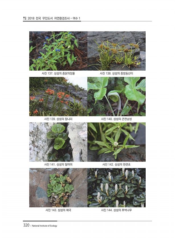 2018 전국 무인도서 자연환경조사 여수 1 320 ? National Institute of Ecology 사진 137. 상섬의 좀닭의장풀 사진 138. 상섬의 중방동산이 사진 139. 상섬의 참나리 사진 140. 상섬의 큰천남성 사진 141. 상섬의 털머위 사진 142. 상섬의 한련초 사진 143. 상섬의 해국 사진 144. 상섬의후박나무
