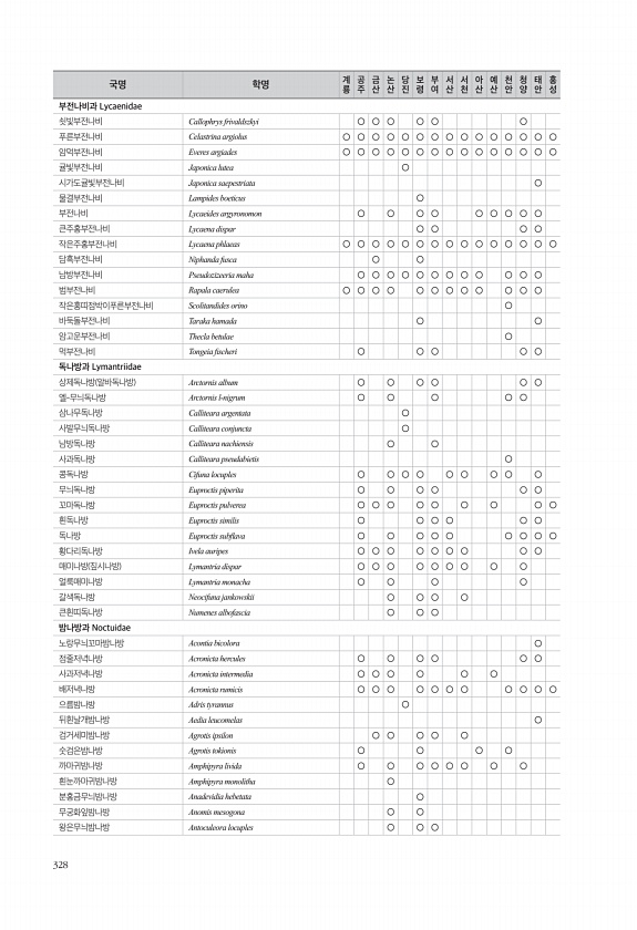 328 부전나비과 Lycaenidae 쇳빛부전나비 Callophrys frivaldszkyi ○ ○ ○ ○ ○ ○ 푸른부전나비 Celastrina argiolus ○ ○ ○ ○ ○ ○ ○ ○ ○ ○ ○ ○ ○ ○ ○ 암먹부전나비 Everes argiades ○ ○ ○ ○ ○ ○ ○ ○ ○ ○ ○ ○ ○ ○ ○ 귤빛부전나비 Japonica lutea ○ 시가도귤빛부전나비 Japonica saepestriata ○ 물결부전나비 Lampides boeticus ○ 부전나비 Lycaeides argyronomon ○ ○ ○ ○ ○ ○ ○ ○ ○ 큰주홍부전나비 Lycaena dispar ○ ○ ○ ○ 작은주홍부전나비 Lycaena phlaeas ○ ○ ○ ○ ○ ○ ○ ○ ○ ○ ○ ○ ○ ○ ○ 담흑부전나비 Nip...