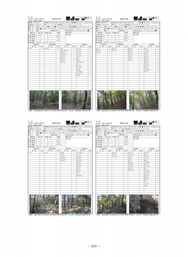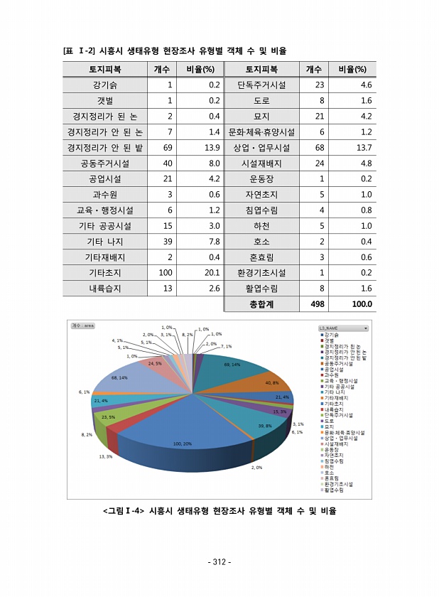 토지피복 개수 비율 % 토지피복 개수 비율 % 강기슭 1 0.2 단독주거시설 23 4.6 갯벌 1 0.2 도로 8 1.6 경지정리가 된 논 2 0.4 묘지 21 4.2 경지정리가 안 된 논 7 1.4 문화·체육·휴양시설 6 1.2 경지정리가 안 된 밭 69 13.9 상업ㆍ업무시설 68 13.7 공동주거시설 40 8.0 시설재배지 24 4.8 공업시설 21 4.2 운동장 1 0.2 과수원 3 0.6 자연초지 5 1.0 교육ㆍ행정시설 6 1.2 침엽수림 4 0.8 기타 공공시설 15 3.0 하천 5 1.0 기타 나지 39 7.8 호소 2 0.4 기타재배지 2 0.4 혼효림 3 0.6 기타초지 100 20.1 환경기초시설 1 0.2 내륙습지 13 2.6 활엽수림 8 1.6 총합계 498 100.0 [표 Ⅰ-2] ...