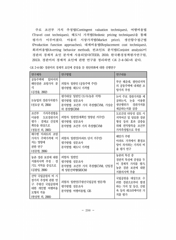 298 연구제목 연구방법 연구내용 공동주택에 있어서의 해안경관 조망가치 분 석 김경률, 2002 피험자일반인 공동주택 주민 평가방법헤도닉 가격법 부산 해운대, 광안리지역 의 공동주택에 내재된 조 망가치 추정 논농업의 경관가치평가 권오상 외, 2004 평가대상일반인 도시v농촌 지역 평가방법설문조사 분석방법조건부 가치 측정법 CVM , 가상순 위 결정법 CRM 논이 주로 경관가치를 제 공하는지, 논을 이용한 생산행위가 경관가치를 제공하는지를 검증 조건부 가치측정법을 이용한 도로경관가치 평가 겸재교 건설계 획안을 대상으로 정동진 외, 2005 피험자일반인 계획안 영향권 거주민 평가방법설문조사 분석방법조건부 가치 측정법 CVM 도로건설 타당성 검토 시 지역여건 및 양호한 경관 형성 등의 효과 검증을 위해 편익항목을...