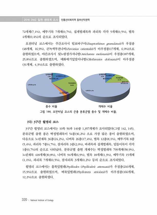 2016 DMZ 일원 생태계 조사 민통선이북지역 동부산악권역 320 ? National Institute of Ecology 72개체 7.1% , 메뚜기목 7개체 0.7% , 집게벌레목과 파리목 각각 5개체 0.5% , 벌목 4개체 0.4% 의 순으로 조사되었다. 오천터널 코스에서는 주간조사시 털보바구미 Enaptorhinus granulatus 가 우점종 48개체, 16.9% , 큰녹색부전나비 Favonius orientalis 가 아우점종 17개체, 6.0% 으로 출현하였으며, 야간조사시 뒷노랑점가지나방 Arichanna melanaria 이 우점종 187개체, 25.8% 으로 출현하였으며, 매화애기잎말이나방 Olethreutes dolosana 이 아우점종 31개체, 4.3% 으로 출현하였다. 종수 비...