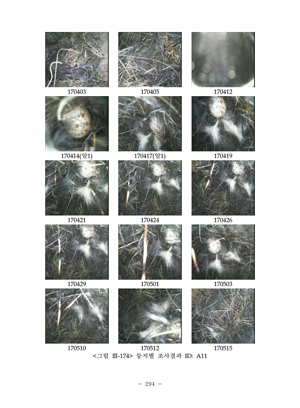 294 170403 170405 170412 170414 알1 170417 알1 170419 170421 170424 170426 170429 170501 170503 170510 170512 170515 그림 Ⅲ-174 둥지별 조사결과 IDA11