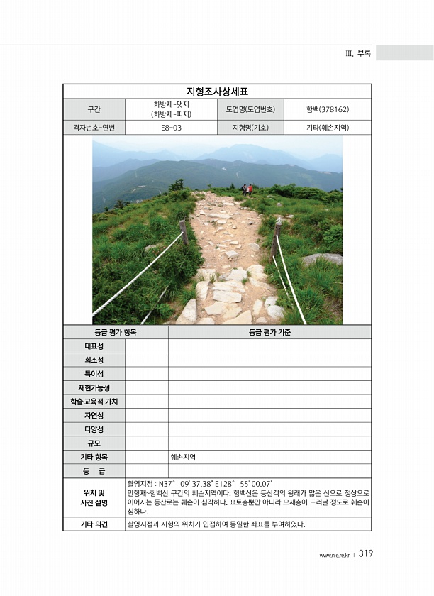 Ⅲ. 부록 www.nie.re.kr ? 319 지형조사상세표 구간 화방재댓재 화방재피재 도엽명 도엽번호 함백 378162 격자번호-연번 E8-03 지형명 기호 기타 훼손지역 등급 평가 항목 등급 평가 기준 대표성 희소성 특이성 재현가능성 학술?교육적 가치 자연성 다양성 규모 기타 항목 훼손지역 등 급 위치 및 사진 설명 촬영지점 N37° 0937.38E128° 5500.07만항재함백산 구간의 훼손지역이다. 함백산은 등산객의 왕래가 많은 산으로 정상으로 이어지는 등산로는 훼손이 심각하다. 표토층뿐만 아니라 모재층이 드러날 정도로 훼손이 심하다. 기타 의견 촬영지점과 지형의 위치가 인접하여 동일한 좌표를부여하였다.