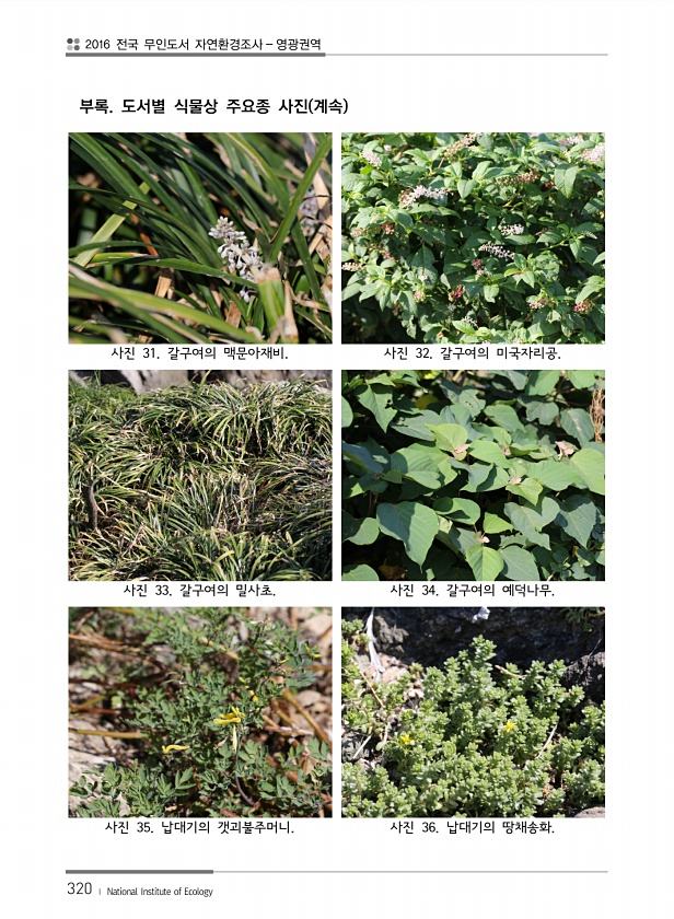 2016 전국 무인도서 자연환경조사 영광권역 320 ? National Institute of Ecology 부록. 도서별 식물상 주요종 사진 계속 사진 31. 갈구여의 맥문아재비. 사진 32. 갈구여의 미국자리공. 사진 33. 갈구여의 밀사초. 사진 34. 갈구여의 예덕나무. 사진 35. 납대기의 갯괴불주머니. 사진 36. 납대기의땅채송화.
