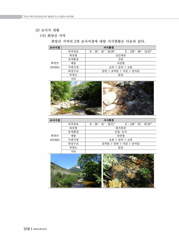 2016 백두대간보호지역 생태계 조사 밀재묘적재 318Ⅰwww.nie.re.kr 2 조사지 개황 가 희양산 지역 희양산 지역의 2개 조사지점에 대한 서식현황은 다음과 같다. 조사지점 서식환경 희양산 HYS01 위치정보 N 36° 42′ 03.39″ E 128° 00′ 14.23″ 하천형 산간계류 유역환경 산림 제방 자연형 수변식생 교목 관목 초본 하상구조 암반 호박돌 자갈 잔자갈 투명도 맑음 기타 조사지점 서식환경 희양산 HYS02 위치정보 N 36° 41′ 36.71″ E 128° 01′ 07.20″ 하천형 평지하천 유역환경 산림, 농지 제방 자연형 수변식생 초본 관목 교복 하상구조 호박돌 암반 자갈 잔자갈 투명도 맑음기타